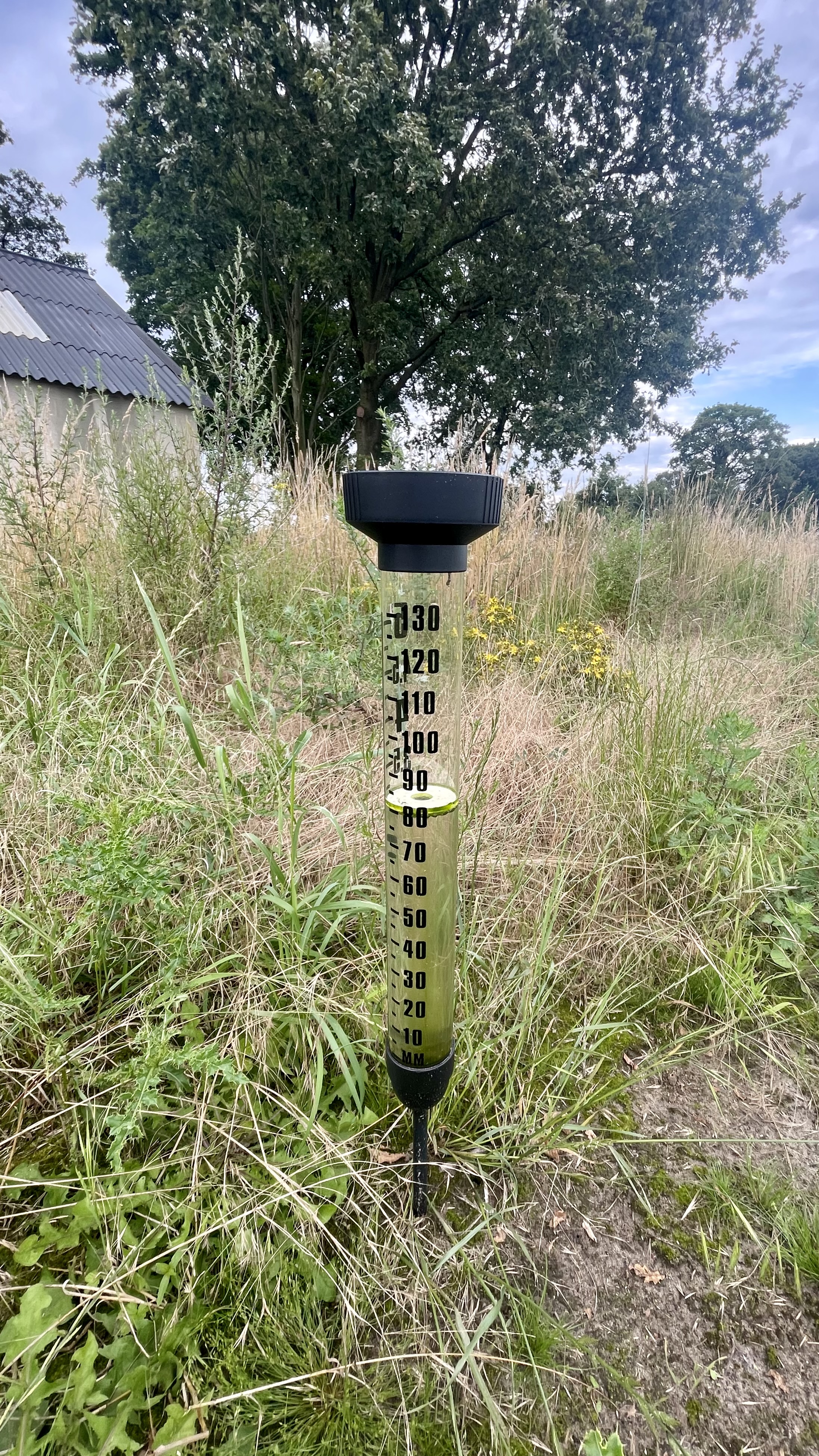 Incidentele beregening tijdens de hittegolf in augustus 2022 om verlies van de mix van twaalf biologische groenbemesters te voorkomen. In 2023 wordt alleen de haag om de akker tijdens droogte middels druppelslang van noodzakelijk vocht voorzien.